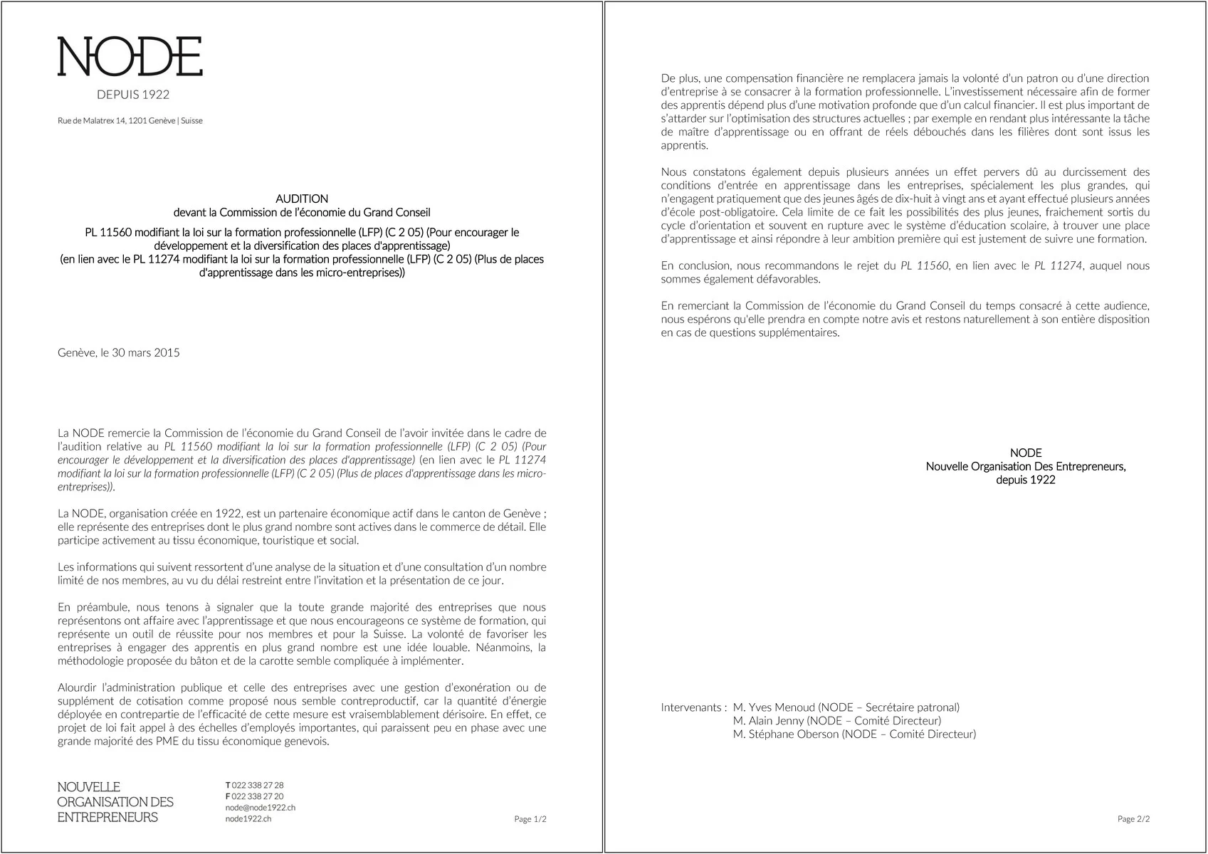 Hier, le 30 mars 2015, la NODE a été auditionnée par la Commission de l'économie du Grand Conseil dans le cadre de l'étude du PL 11560 modifiant la loi sur la formation professionnelle (LFP) (C 2 05) (Pour encourager le développement et la diversification des places d'apprentissage) (en lien avec le PL 11274 modifiant la loi sur la formation professionnelle (LFP) (C 2 05) (Plus de places d'apprentissage dans les micro-entreprises)).
