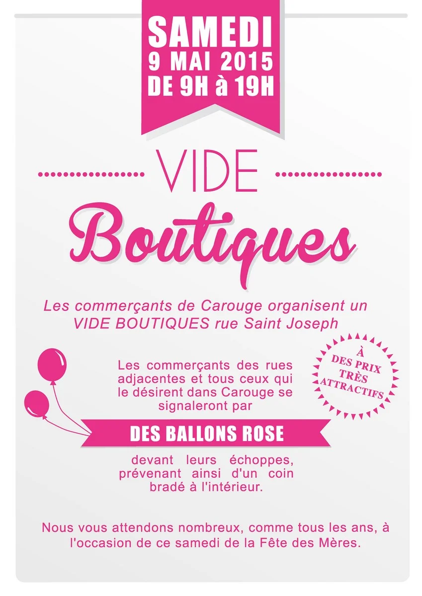 Ce samedi 9 mai 2015, jour de la Fête des Mères, les commerçants carougeois organisent leur braderie annuelle, rebaptisée cette année "Vide Boutiques".